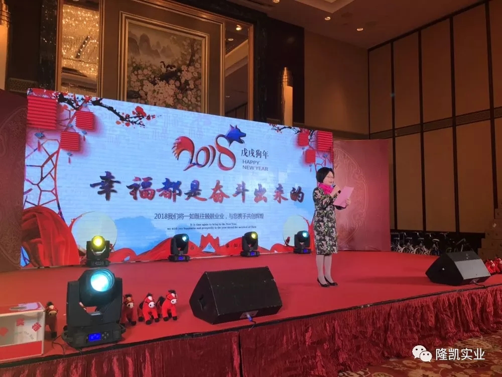 下午18:00点,隆凯集团晚宴准时拉开帷幕。晚宴由美丽动人、才华横溢的进出口和商管公司的代表分别担任男女主持。年会气氛的第一个小高潮是由邬瑛荻董事长为来宾及全体员工致新年祝词。“盛世华厦迎新岁,气搏云天奋犬年”,邬董首先代表隆凯集团董事会和总裁室向关心、支持隆凯发展的所有领导和来宾朋友们表示了衷心的感谢!向全体隆凯集团的员工同事们致以了诚挚的节日问候。邬董用一杯载满深情的香槟敬所有为隆凯集团事业的发展挥洒汗水和智慧的同仁们,并表达了对隆凯集团未来发展的信心和期待!